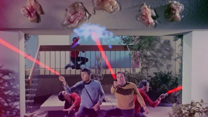 I recall watching a rerun of the "Star Trek" episode "Operation — Annihilate!" (April 13, 1967) as a child, and being tickled by the silliness of its central monster. The monsters were little, rubbery, veiny flesh-flaps that could fly through the air, and adhere onto the backs of their victims. The creatures then inject some of their own organic material into a host, causing the host to go insane. Indeed, the whole central concept of the monsters is straight out of H.P. Lovecraft. Kirk (William Shatner) and his crew eventually find that the monsters are the singular cells of a large, ineffable, hive-minded creature.