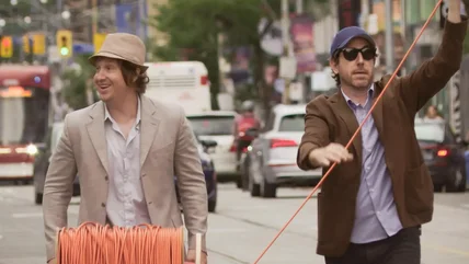 We're talking about "Nirvanna The Band The Show The Movie," and don't worry if that title doesn't make sense. It's a film adaptation of a TV show called "Nirvanna The Band The Show," which was itself an adaptation of a web series of the same name. The title is a joke in itself, and all you really need to know is that the film continues the exploits of creatives and lifelong best friends Matt Johnson and Jay McCarrol, who played fictionalized versions of themselves in a band called "Nirvana the Band." Their goal since 2008 has been to play a show at Toronto's hip venue The Rivoli. Matt is always coming up with some kind of harebrained scheme to get them in the door, while Jay improvises songs on the piano, prompting Matt to add his own spoken word silliness on top of them.