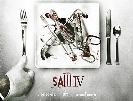 A couple days back we posted (via: MovieWeb) the first teaser poster for SAW IV. Turns out, it wasn't a teaser poster at all. Lionsgate contacted us and informed us that the art was actually "not any kind of official art for the film, it was the INVITATION to a press event". The imagery of "the plate, silverware and server gloves are a direct reference to the fact that this is an invitation to an event at a restaurant." So there you have it.