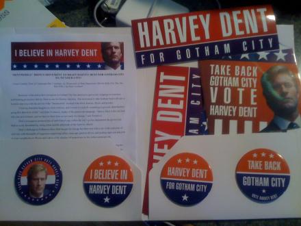 I just received a package via FedEx at the house that we're staying at in Austin Texas for SXSW. I don't know how they found me, but they did. The return address on the FedEx package lists an address for the I Believe in Harvey Dent Campaign Office. Inside was a folder containing a press release (written in character) about how an independent grassroots movement of Gotham City citizens are traveling around to garner support for Gotham City's Harvey Dent potential decision to run for District Attorney. A quote from the press release reads: