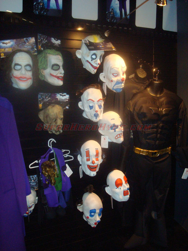 Over at SHH, a tipster sent in pics of Halloween costumes and masks from a Las Vegas showcase for The Dark Knight, including those pretty friggin' eerie Heath Ledger/Joker masks above. Halloween 2008 just got a helluva lot scarier imagining six year old hooligans giggling down darkly lit streets in those things. Also, the tipster supposedly received a spoilerish reason for the lack of Two Face costumes. After the hop, we have the spoiler (I'd rank it a 6 out of 10) and two big photos of the get-ups...