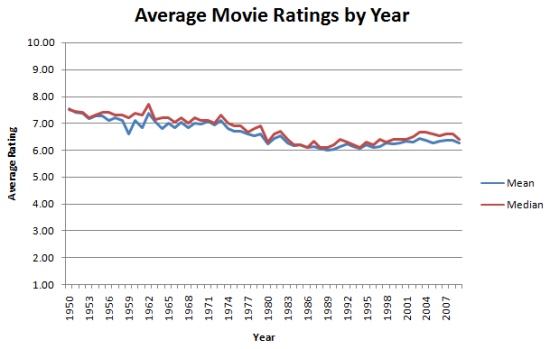 Nathaniel Johnson has taken a look at the IMDb user ratings of the movies released theatrically over the last 60 years to see whether there is a trend in their perceived quality over time.Bruce Greenwood and David Walliams have joined the Steve Carell, Zach Galifianakis and Paul Rudd comedy Dinner for Schmucks, which Jay Roach is directing. [variety]