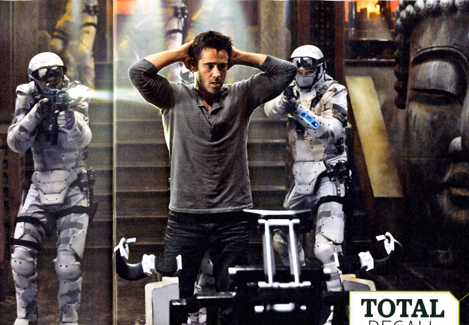 Yesterday we saw the first images of sets for the new Total Recall sets, on them some white-suited troopers. Now we've got the first image of Colin Farrell in the lead role of Doug Quaid, a factory worker who learns, or thinks he learns, that he is really a spy for one of two nation states, Euromerica or New Shanghai. See the full image after the break.