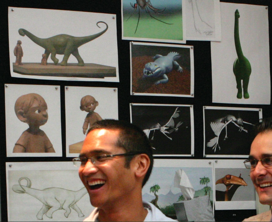 Later, PixarTalk posteda photo showing Up production designer Ricky Nierva standing in front of even more concept art from the project, showing the boy, a brontosaurus, a prehistoric alligator, a pterodactyl, and a mosquito. Check out the full photo below.