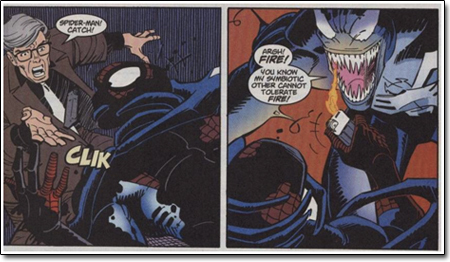 Everyone knows about the famous superhero weaknesses: Superman and Kryptonite, Spider-Man and pretty girls, but what about the worst, most ridiculous ones? Cracked has great list including the photo above of Venom, who can't deal with fire. (From Russ: well, fire's not that wimpy. If it'll scare off xenomorphs, it has to be worthy of respect.)