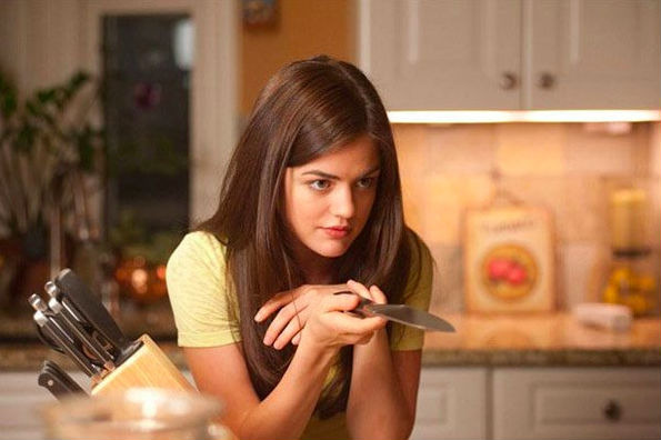 Without a beginning of this clip, we're lead to assume the first two segments of the opening featuring Lucy Hale, Kristen Bell and others watching scenes from the Stab sequels are probably the same as the finished film and that this, the actual murder, is the only part that's changed. In the final film, this scene starts the same. However when Jenny goes downstairs to investigate, Marnie doesn't pretend like she's dead, she actually is. Then Ghostface stalks and kills Jenny interspersed with a bunch of dialogue about blondes in horror movies.