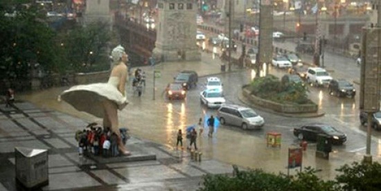 Header Photo: Chicago tourists take shelter from the rain under Forever Marilyn's upskirt statue.