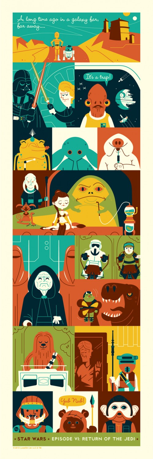 I love the balance here, each poster has almost the exact same composition, except for the Jabba frame in Jedi. That character was probably just too big for one, small frame. It works.