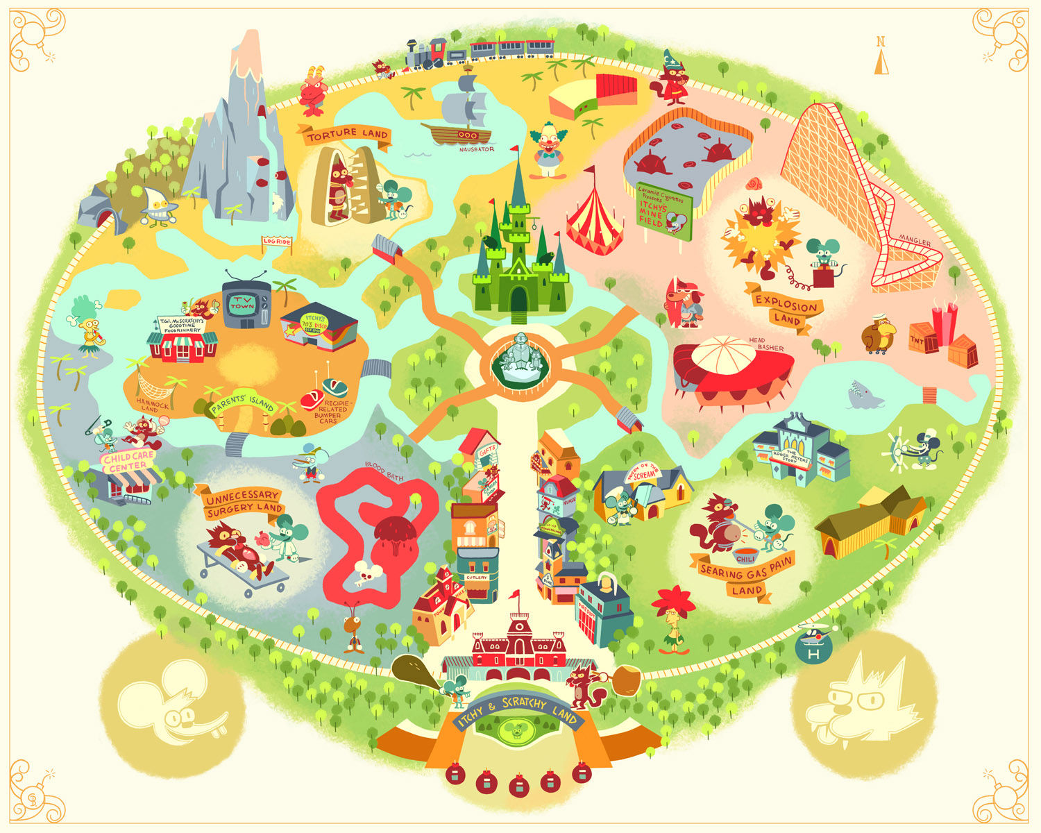 Glen says: "This piece is an excuse for me to combine two things I love: the design of old Disney theme park maps and The Simpsons. I went through the Itchy and Scratchy Land episode and took lots of screen captures and notes to get the map as accurate to the show as possible."