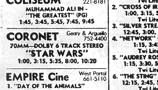 SF Gate has much more. If you like your Star Wars geekery mixed with a generous dose of nostalgia, you'll also want to read their lovely oral history of the Star Wars experience at the Coronet.