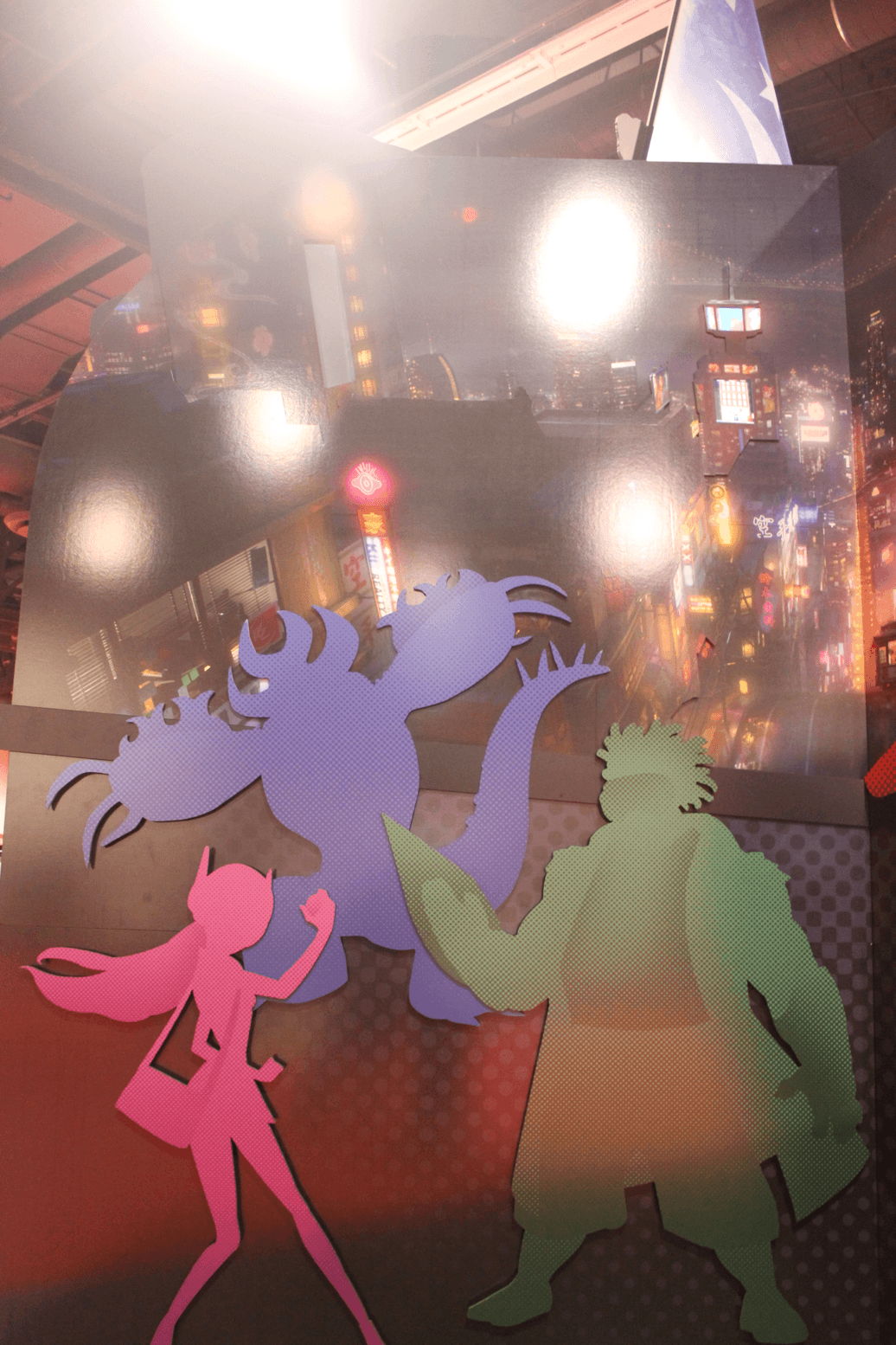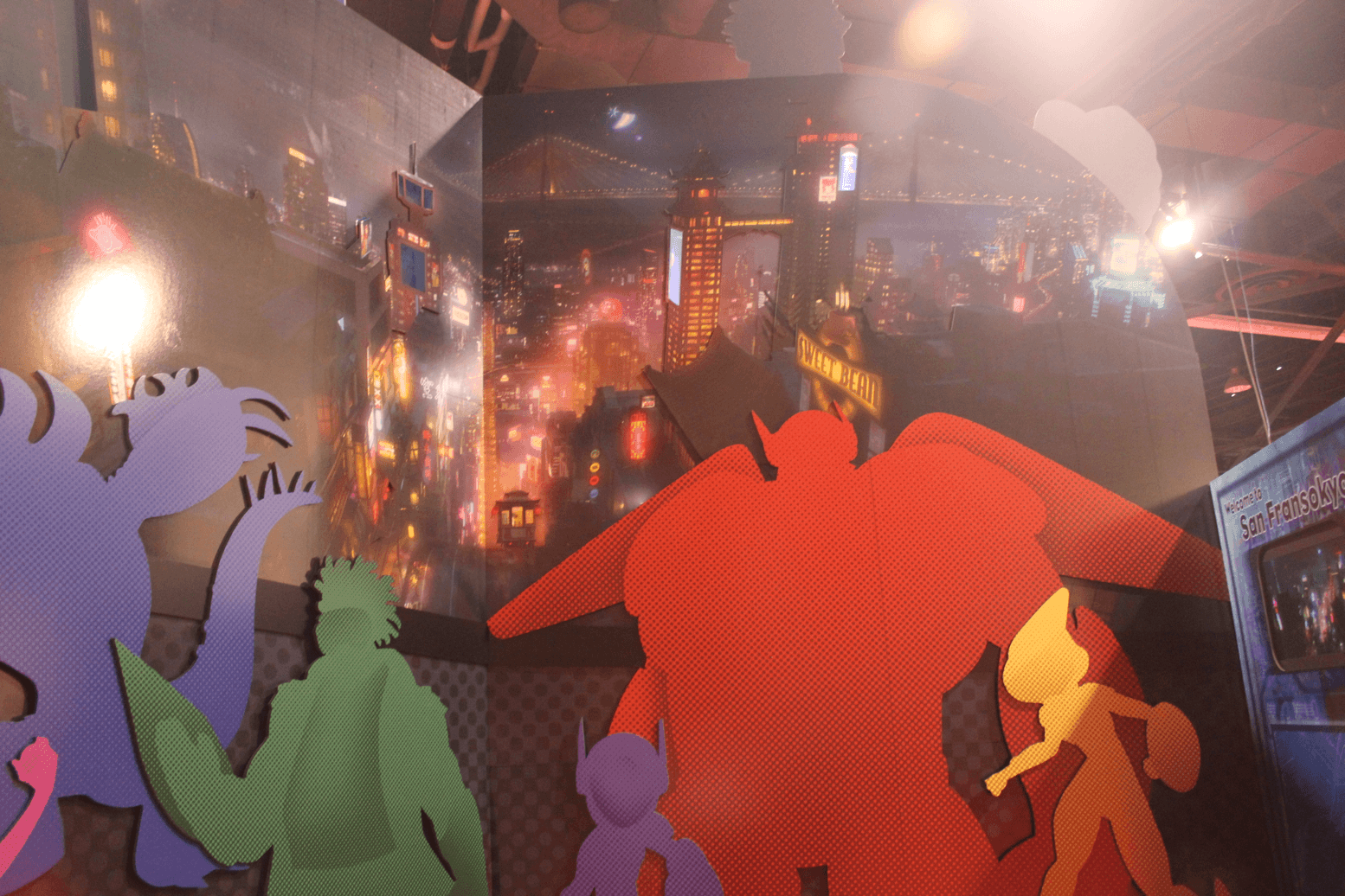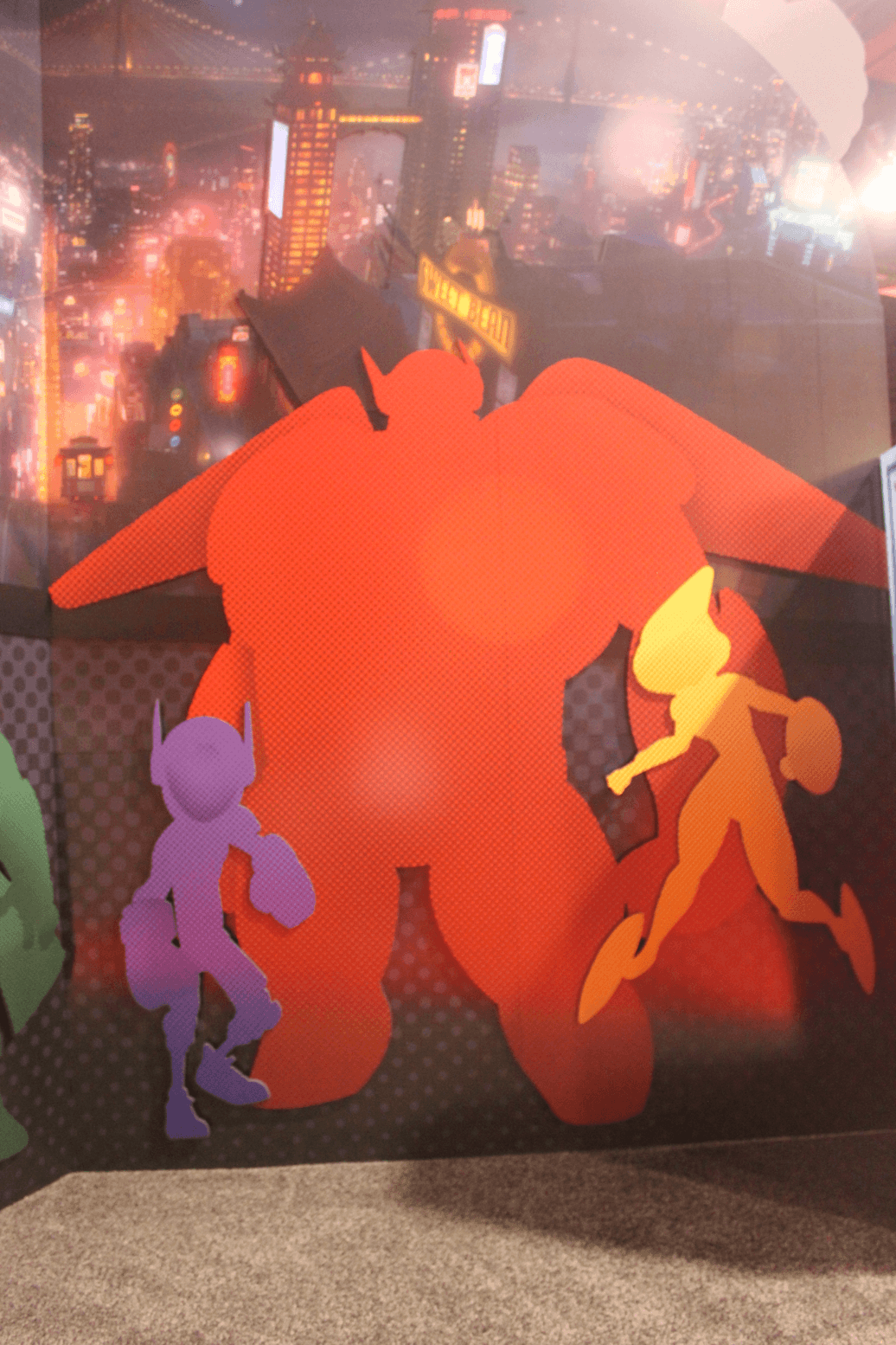 While walking to the D23 Expo Imagineering pavilion for the Thursday night press preview, I came across a small booth advertising Disney Animation's big screen adaptation of Marvel Comic's Big Hero 6. We haven't seen much from the Don Hall-directed November 2014 release, but we're expected to see some footage at Disney's Animation panel on Friday morning (check back for a reaction later in the day). In May we were given a sneak peek into the world of the movie with a piece of concept art and mood video revealing the film's location San Fransokyo. The booth on the D23 show floor doesn't show us much more, but does give us a look at the silhouettes of the film's Big Hero 6 superhero team. Check out photos of that art, after the jump.