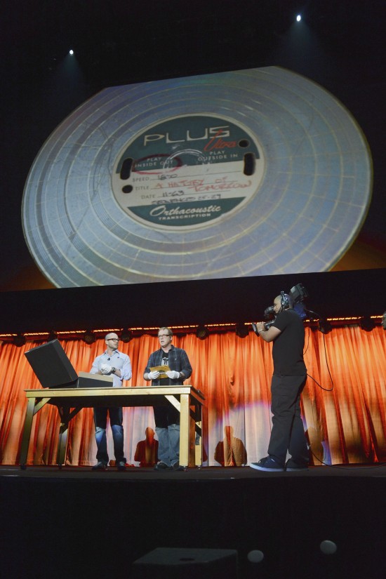Found in the box is a 9-inch disc that resembles an old Phonovision record, but is apparently "an experimental form of video storage technology similar to the laserdisc." The disc was dated "November 1963." The audio tour at D23 Expo claims that Damon Lindelof and Brad Bird brought in visual effects producer Tom Peitzman (Alice In Wonderland, Mission: Impossible — Ghost Protocol) to figure out a way to extract data from the disc. His team supposedly found "a never-before-seen piece of Disney animation from the early sixties." But problem is the content on the disc had been severely damaged. So who did Bird and Lindelof bring in? Data extraction specialists? The CIA? Nope... Pixar.