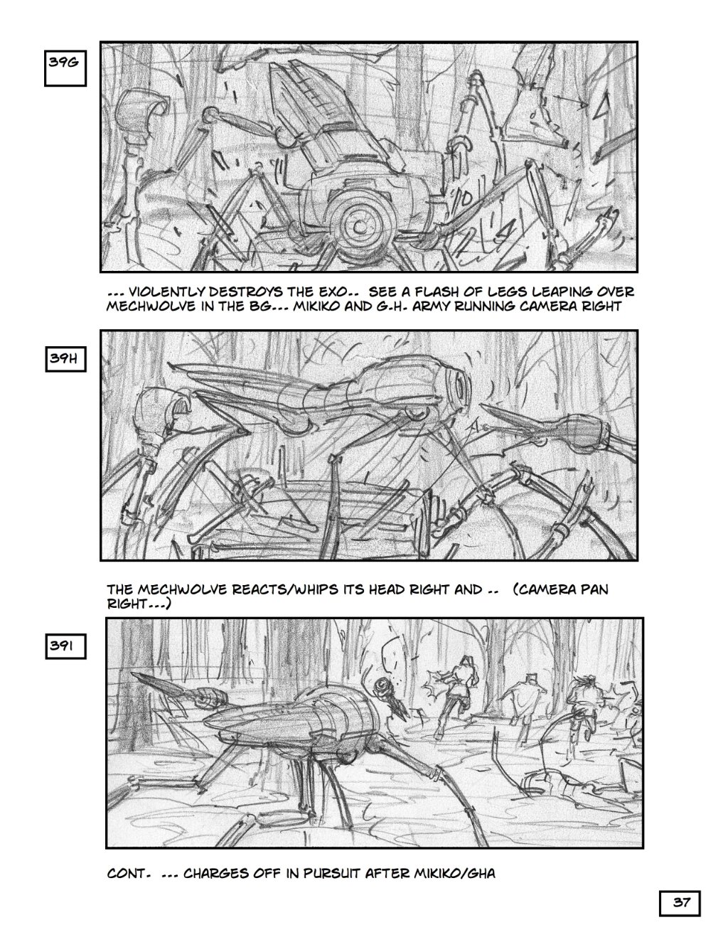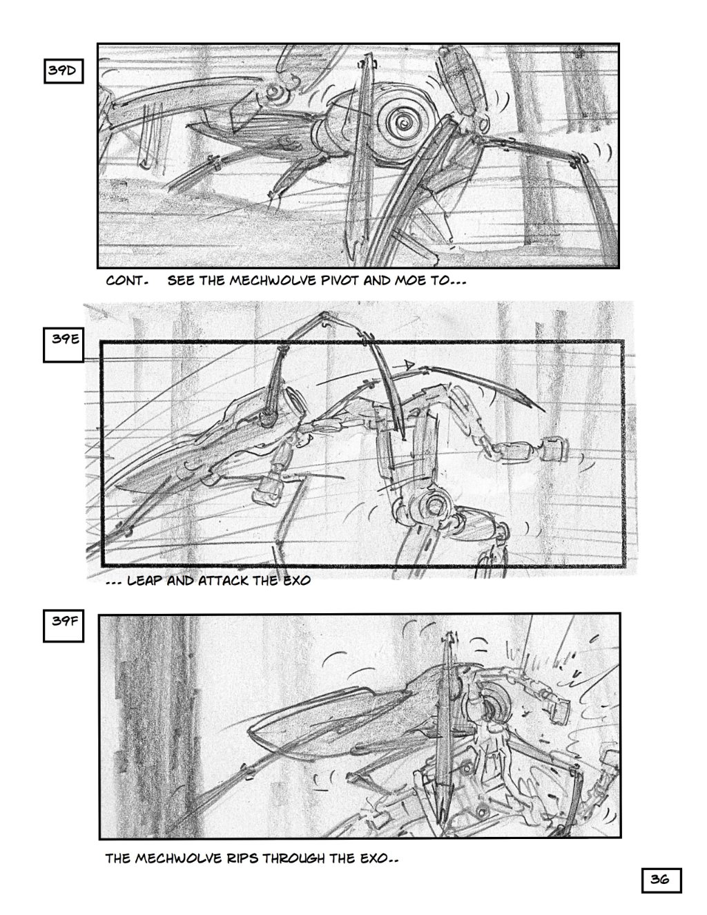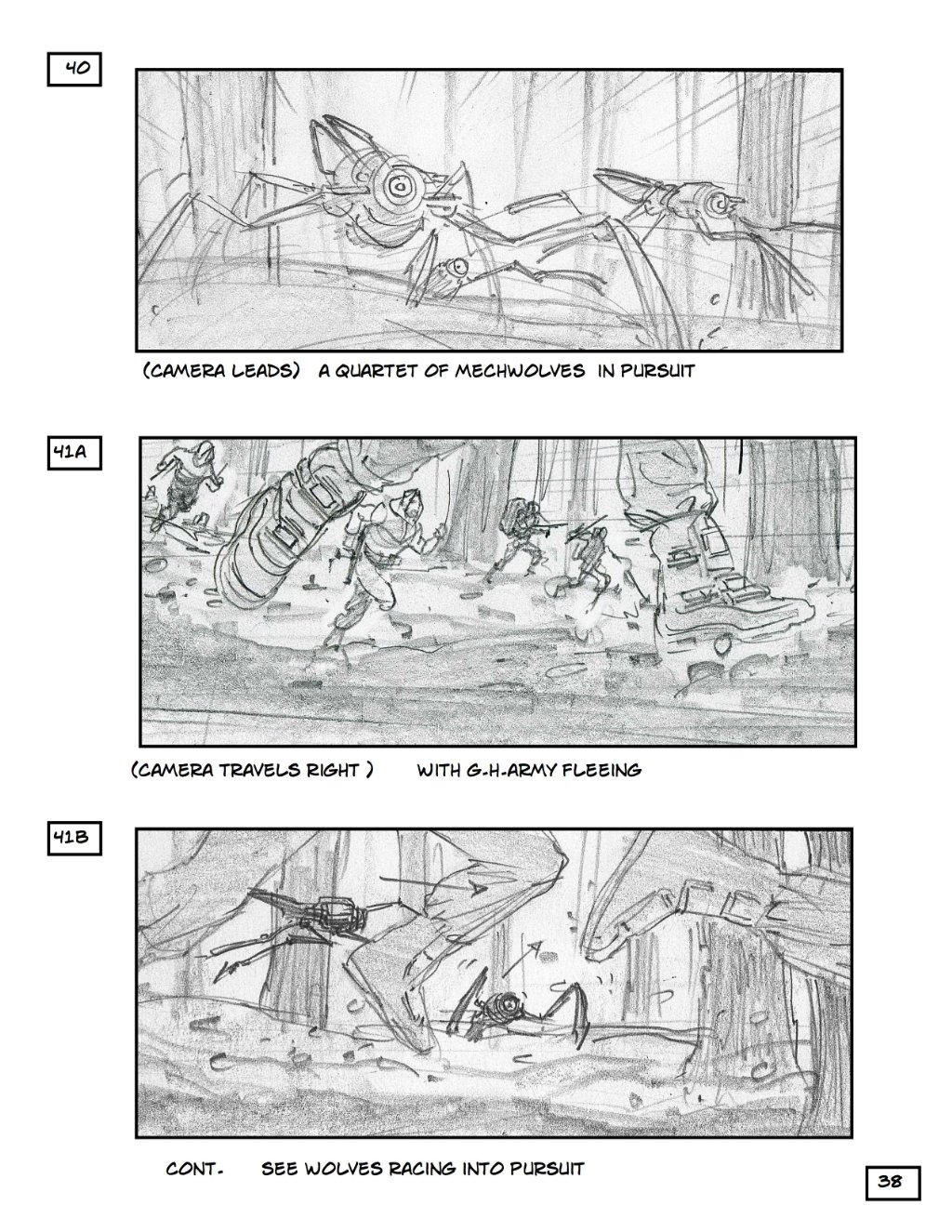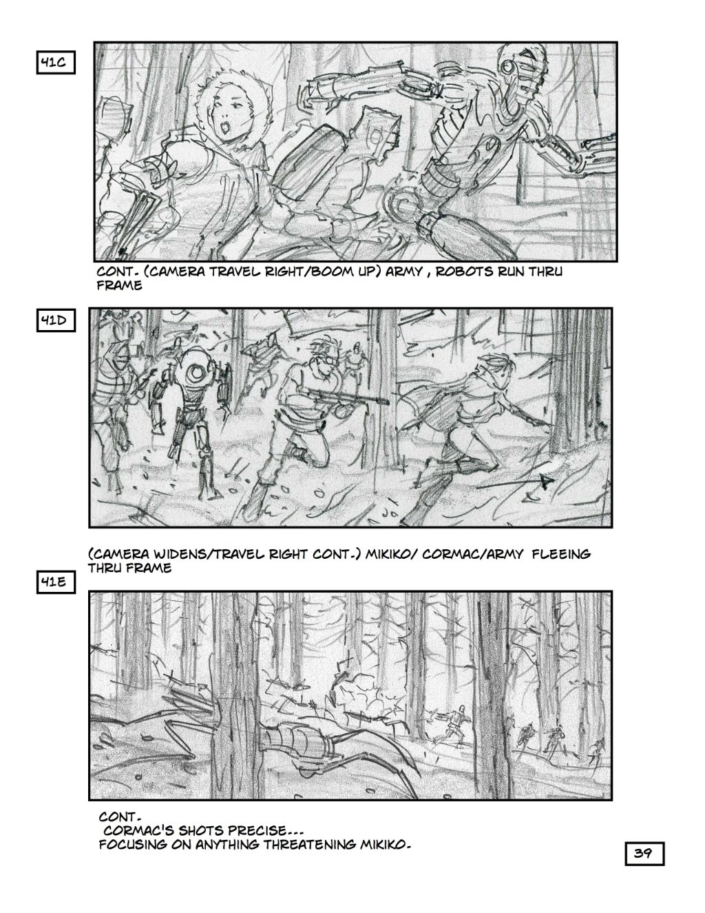 The boards go from left to right here, and show a pretty cool action sequence with robots chasing a band of humans through the woods. You get an idea here of just how big and expensive Robopocalypse will be to make, and why Spielberg decided to put a pin in it until everything was ready.