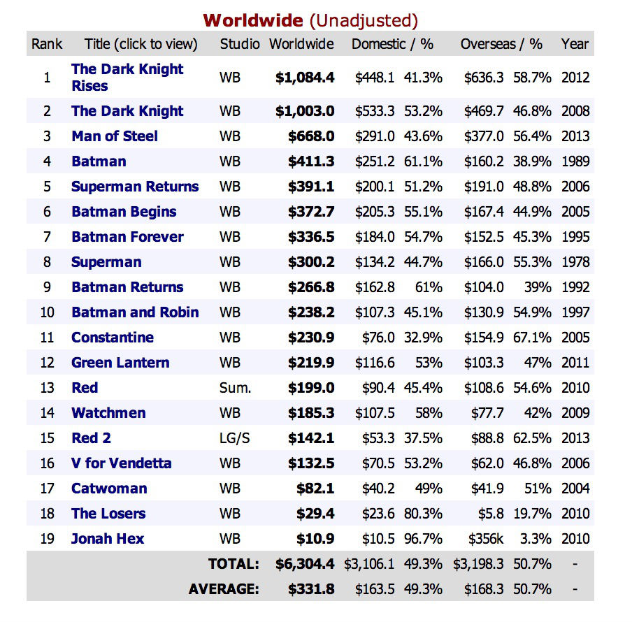So it's a stretch, but it's true. If you take DC's total output versus the Marvel Cinematic Universe, DC exceeds it in sales. The comparison is highly skewed, though, because you're looking at six years for Marvel and 36 for DC.