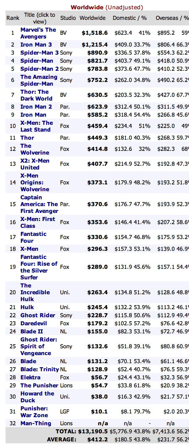 However, if you look strictly at Marvel Cinematic Universe movies (meaning no X-Men, no Spider-Man, no Blade, which is what the letter refers to by talking about different studios) those have grossed $5.7 billion. And DC then beats it globally.