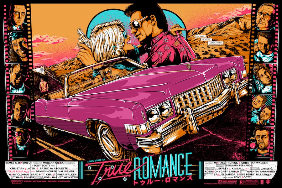 When Odd City approached me to create a poster for True Romance, my jaw hit the floor. To say I was flattered is an understatement. I fell in love with this film from the first time I viewed it on VHS.... A rental copy, no less. It's a film that has always stuck with me – so much so that, at one point, I was seconds away from a past girlfriend and I getting matching "Clarence" and "Alabama" cupid tattoos to commemorate the film. This movie is so vivid and colorful in its writing, characters and film style. I really wanted to give my all in complimenting the film, by approaching the artwork in the same way.