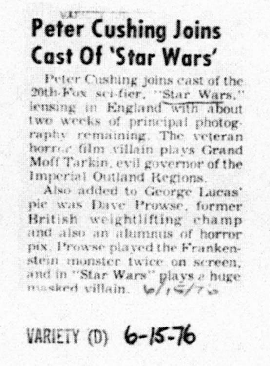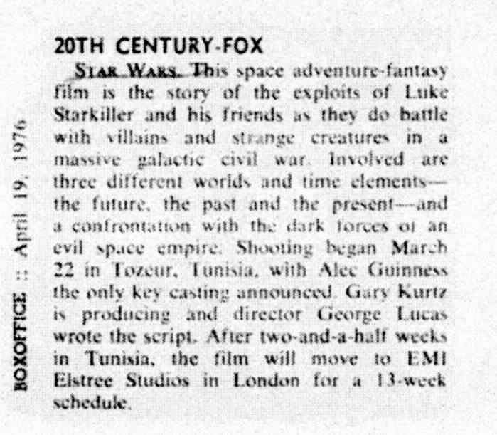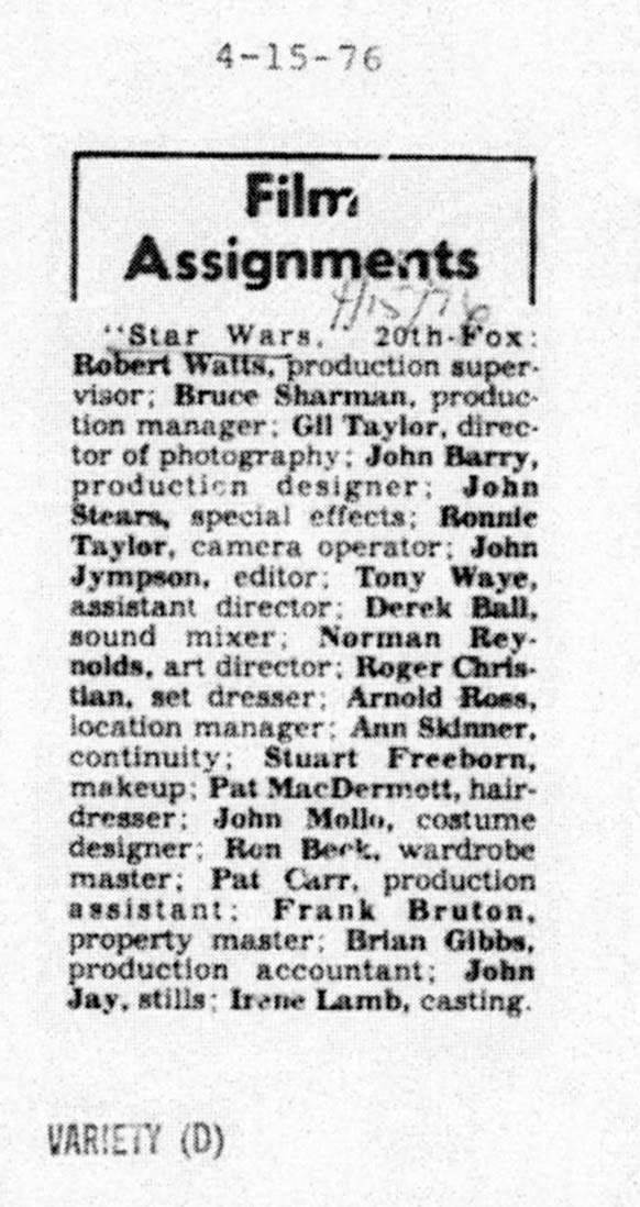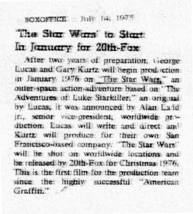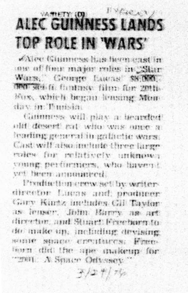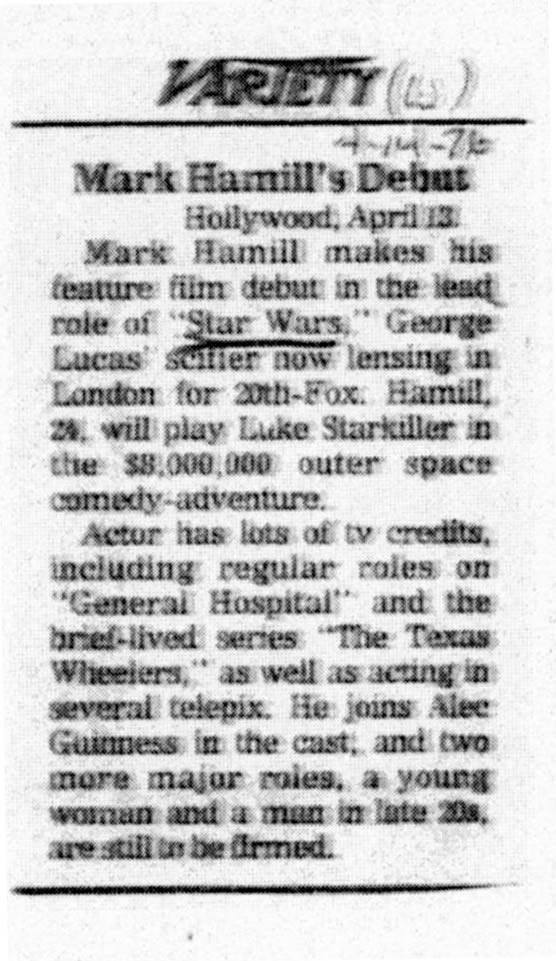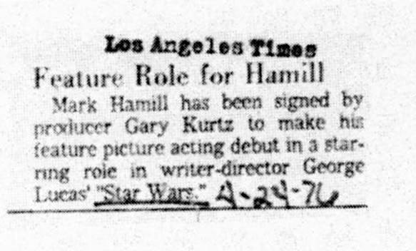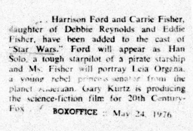Things were a tad different in 1975 when the cast for a film then called The Star Wars was announced. Small blurbs in Box Office Magazine, the LA Times and Variety revealed to the world little known actors Mark Hamill, Harrison Ford and Carrie Fisher were going to be in an ambitious sci-fi film from the guy who did American Graffiti.