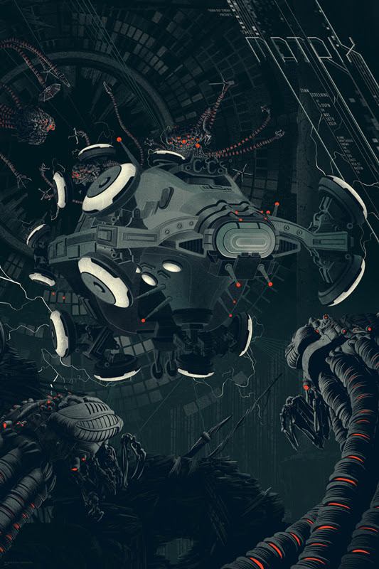 These are also 24"x36" screen prints. Hand-numbered. The regular is an edition of 275 and costs $45 and the variant is an edition 150 and costs $65. (As for the text, it says "Tough Guy Cinema Presents THE MATRIX 35 MM Screening at 5:00 pm on May 18th 2014 Alamo Drafthouse Cinem