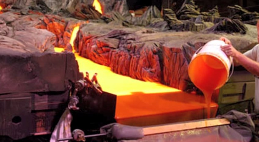 Here is a look at the incredibly expansive miniature set created for the lava fight sequence on Mustafar. They shot this miniature for five to six months in darkness. The 25 feet wide by 50 feet long miniature set was built on a tilt so that they could pour slime down the lava streams as lights would illuminate from below.