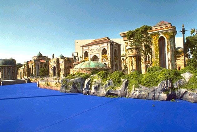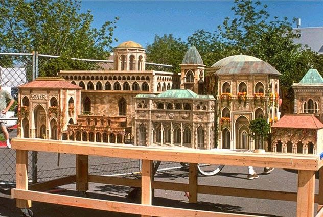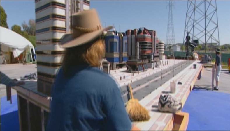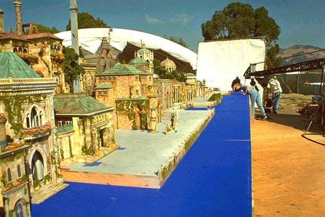 Here is a look at some of the practical miniatures created for the Podracing sequence in Star Wars Episode I: The Phantom Menace. Not only did they create the huge podracing arena set but they also build incredibly detailed miniature versions of the podracing vehicles. Notice how the far shots of the podracing crowd were just painted q-tips. One of the shots below even features an actress on a balcony overlooking a small miniature model set.