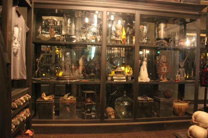 Borgin and Burkes features tons of dark art artifacts on the shelves overhead. Swords, skulls, specimens in jars. Shandaliers made of torture weapons hang from above. In the glass cases you can see such dark artifacts as displayed skeletons of a mer-person and a troll. Again, another faithful replication/expansion of what we saw in the movies. Here you can buy shirts and merchandise featuring Voldermort and other dark arts characters. They sell glass skulls and many other objects not seen elsewhere in the wizarding world.