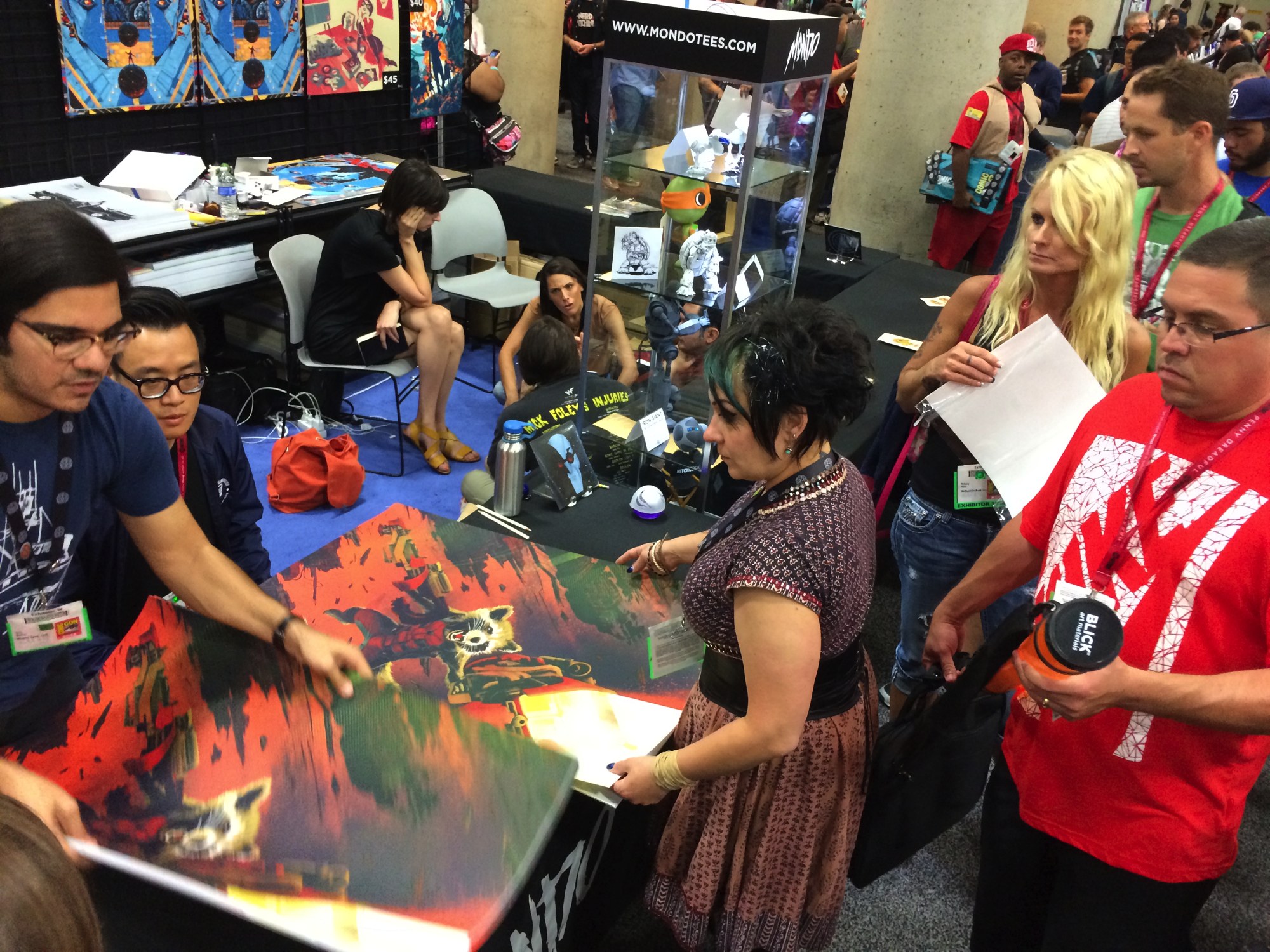 Kevin Tong signing his great Guardians of the Galaxy Rocket Raccoon print at the Mondo booth