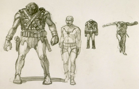 "George said he wanted Chewbacca to look like a lemur, so he had great big limpid eyes in some of my early sketches. George also gave me a drawing he liked from a 1930s illustrator of science fiction that showed a big, apelike, furry beast with a row of female breasts down its chest. So I took the breasts off and added a bandolier and ammunition and weapons, and changed its face so it looked somewhat more like the final character, and I left it at that."
