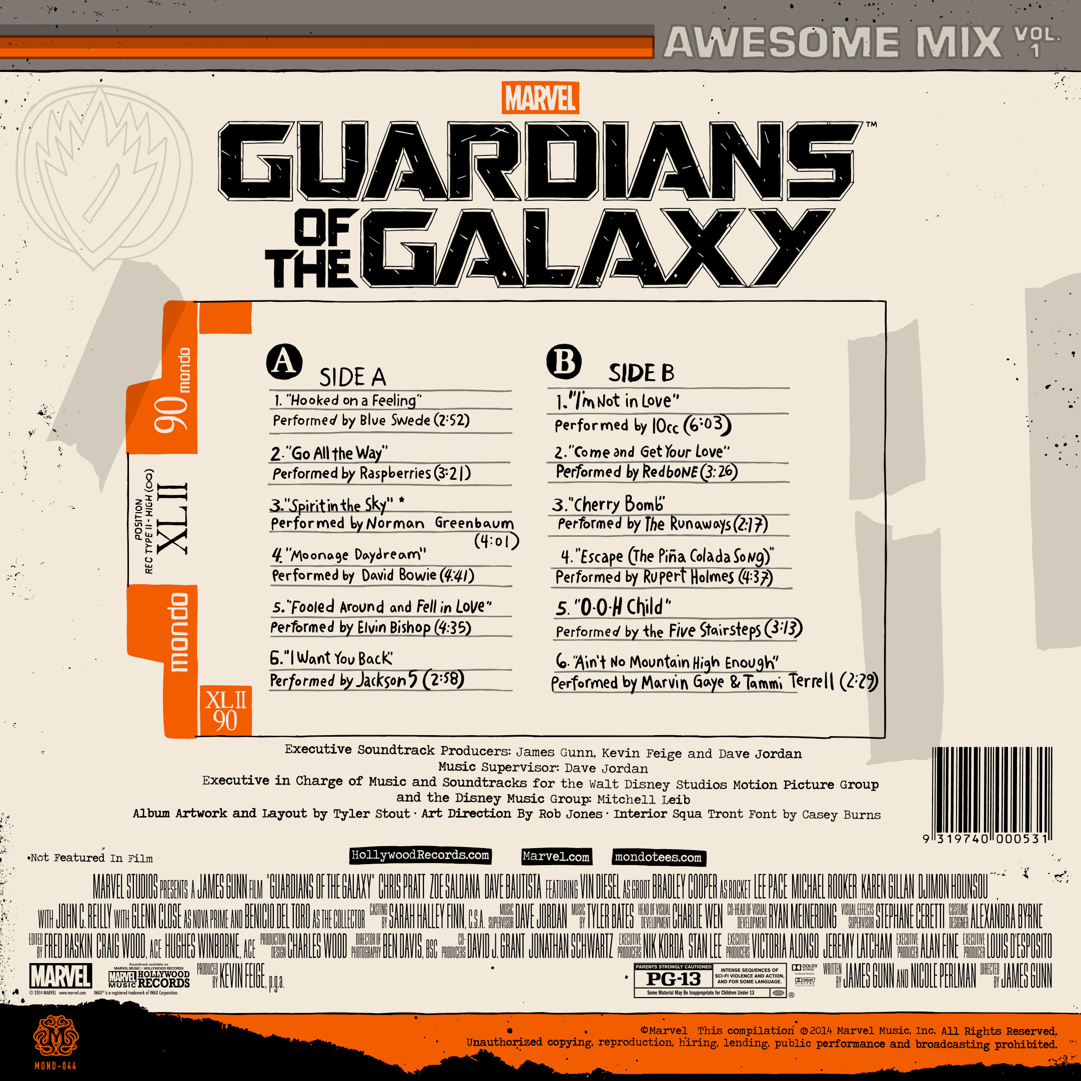 MONDO, under license from Marvel Music and Hollywood Records, unleashes the cooler than cool 1970s soundtrack on vinyl from the blockbuster hit space adventure, Marvel's "Guardians of the Galaxy." Pre-order for this deluxe vinyl package begins today and will be available for sale on MondoTees.comThe cover artwork from artist Tyler Stout is an appropriately epic collage of misfits featuring the instantly iconic heroes and villains of the summer's most beloved film. Tyler Stout continues his stellar work for Marvel films that began with Marvel's Iron Man and has continued throughout the ever-expanding Marvel Cinematic Universe.Available for pre-rrder beginning today, Mondo is pleased to present a deluxe vinyl release of the Guardians Of The Galaxy: Awesome Mix Volume 1 soundtrack featuring original artwork by Tyler Stout. What makes this release deluxe, beyond Tyler's amazing artwork, is that every copy comes pressed on 180 Gram Purple Infinity Stone colored vinyl, and this is Mondo's very first screen-printed album packaging.Printed by D&L Screenprinting, each jacket will have the look and feel of a Tyler Stout screen-printed poster. Also, as an additional bonus, each record comes with one of nine randomly inserted screen-printed handbills featuring various characters from the film.Because of the hand-done nature of this project, both in the vinyl and packaging, we do not expect these to begin shipping until Early 2015. Please note that this is a pre-order before purchasing.Tracklisting:1. Hooked on a Feeling – Blue Swede2. Go All the Way – Raspberries3. Spirit in the Sky – Norman Greenbaum4. Moonage Daydream – David Bowie5. Fooled Around and Fell in Love – Elvin Bishop6. I Want You Back – The Jackson 57. I'm Not in Love – 10cc8. Come and Get Your Love – Redbone9. Cherry Bomb – The Runaways10. Escape (The Piña Colada Song) – Rupert Holmes11. O-O-H Child – The Five Stairsteps12. Ain't No Mountain High Enough – Marvin Gaye and Tammi TerrellAll screen-printing by D&L Screen-Printing of Seattle, WA. All artwork by Tyler Stout.