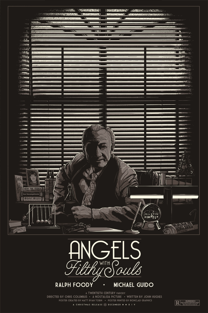 With the holidays coming up, artist Matt Ryan has created an awesome example of this. He's releasing a poster for Angels With Filthy Souls. Now, that's not a real movie but fans know what it is. It's a movie that was made inside the movie Home Alone. And once you get that, this poster blossoms because it's packed with clever references to that blockbuster hit.