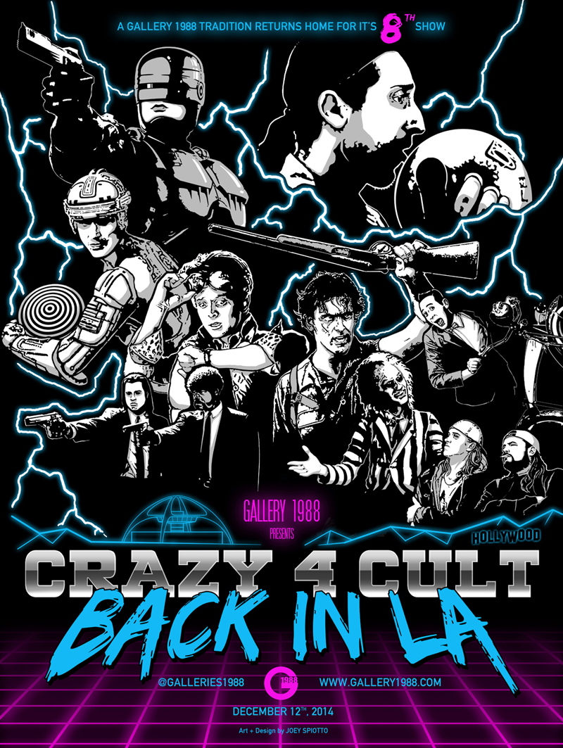 Gallery1988 will bring it's most celebrated show, Crazy 4 Cult, BACK TO LOS ANGELES, after two years in New York. The 8th annual art show is the spark that ignited dozens of galleries, and a genre, as the first exhibition to solely celebrate cult films with 100 artists participating. It's also the subject of two internationally released books from Titan Publishing, while amazing cult filmmakers like Kevin Smith, Edgar Wright, Frank Darabont, Seth Rogen, Jason Reitman and Richard Kelly all have pieces in their collections from C4C.