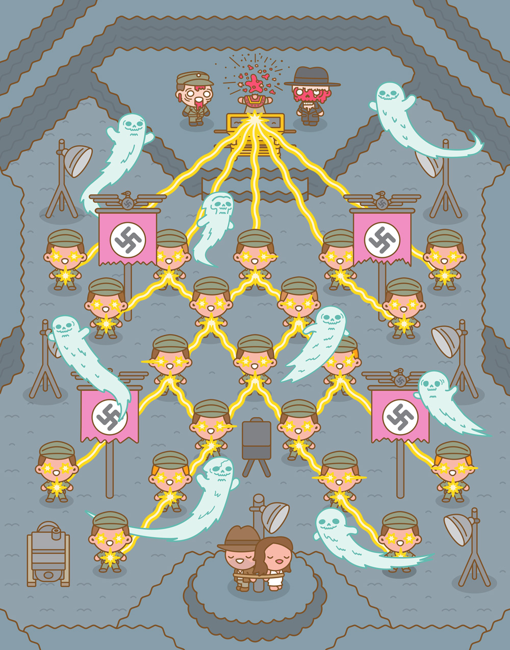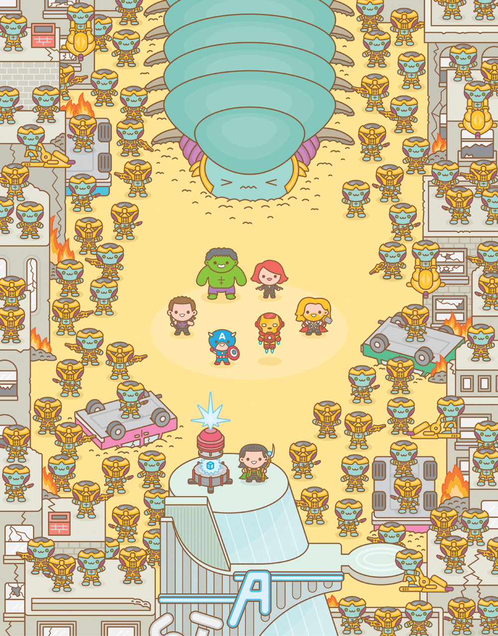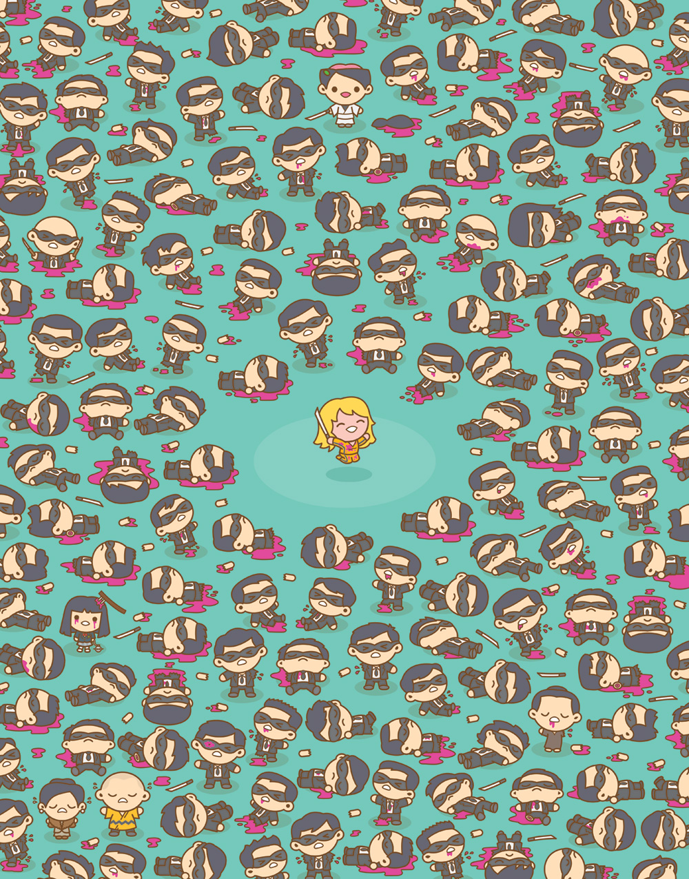 Some examples of this "Mass Hysteria" is the end of The Avengers, the Crazy 88 in Kill Bill, the hallway in Oldboy, the finale of Raiders of the Lost Ark and many other mass gatherings in pop culture, all viewed through that cute little filter. The results are just beautiful and gory and awesome. In a phrase: mind-blowing. Check out a small sample of the 30 + images in the Mass Hysteria art show below.