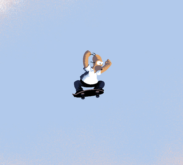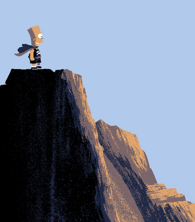 What I love about this piece, like lots of Englert's work, is that it doesn't immediately scream "Pop culture." You could frame this piece, place it somewhere and it might just look like a beautiful landscape. But when you get closer and see Homer on the skateboard, Bart on the ledge, and that crazy drop, it immediately becomes something very special.