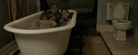 They lean back in the tub as Frank prepares to push a button on his remote control.