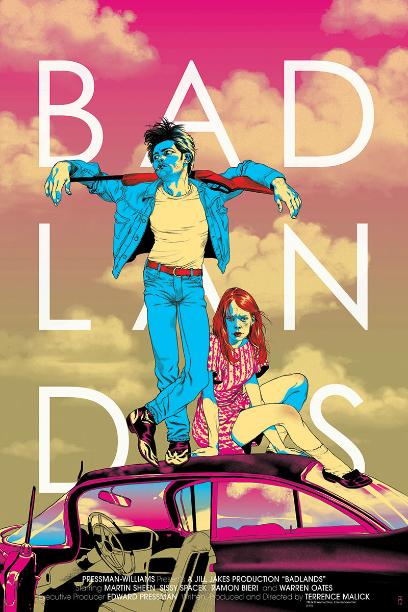 Mondo has just announced they're doing a series of posters based on the films of Terrence Malick. It'll take place over the course of the year but it's starting in the same place Malick did, the 1973 film Badlands. Martin Sheen and Sissy Spacek starred in the story of a young girl who takes taken on a killing spree by her boyfriend. Artist Tomer Hanuka did the poster and it goes on sale March 19. Below, see the full image of the Mondo Badlands poster.