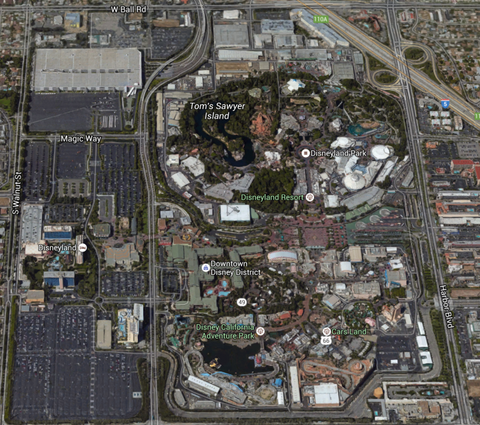 TheDisneyBlog has some more outrageous theories about the future of Disneyland Resort. They theorize that Disneyland adding a new parking structure could allow the Mouse to do something with the Lion King parking lot behind Paradise Pier Hotel (area C in red in their image above) and the remote parking lots (area A in blue) south of Katella and East of Harbor Blvd. The blog suggests the areas could house a third theme park or the long rumored water park.