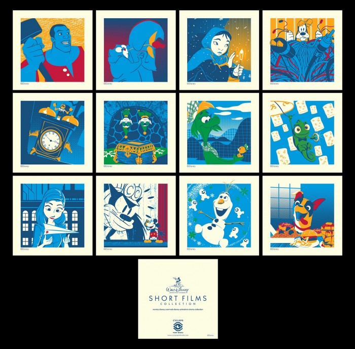 Cyclops Print Works will be releasing a set of Walt Disney Animation Studios Short Films Collection handbills by artist and Disney art director Joe Dunn.  The collectible 5" x 5" 5 Color Serigraph handbills will be passed out throughout the D23 Expo, one for each of the 12 short films included in the new Walt Disney Animation Studios Short Films Collection home video release.  The handbills are rinted on Conventry Rag Vellum 320 gsm paper by Eclipse Workshop.