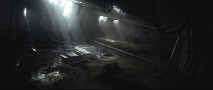 Notice the Rebellion-era TIE and transport ships laying in the wreckage of this Star Destroyer launch bay, as Rey rappels down from above.