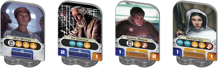 • The Rebel Alliance starts with Mon Mothma, Jan Dodonna, General Rieekan, and Princess Leia.