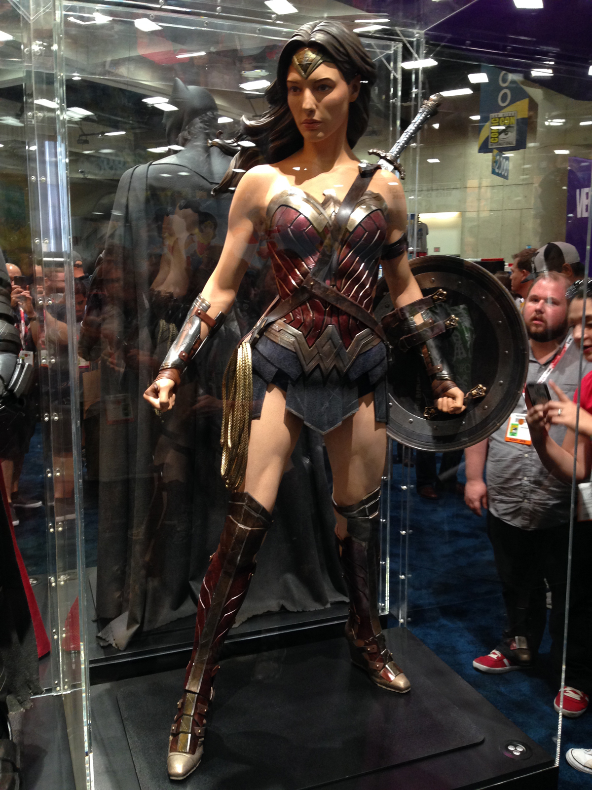 For comparison, here's what Gal Gadot will look like as Wonder Woman in next year's Batman v Superman: Dawn of Justice. (The photo on the left is to give a better sense of the colors.) If nothing else, at least the boobs are less aggressively spherical.