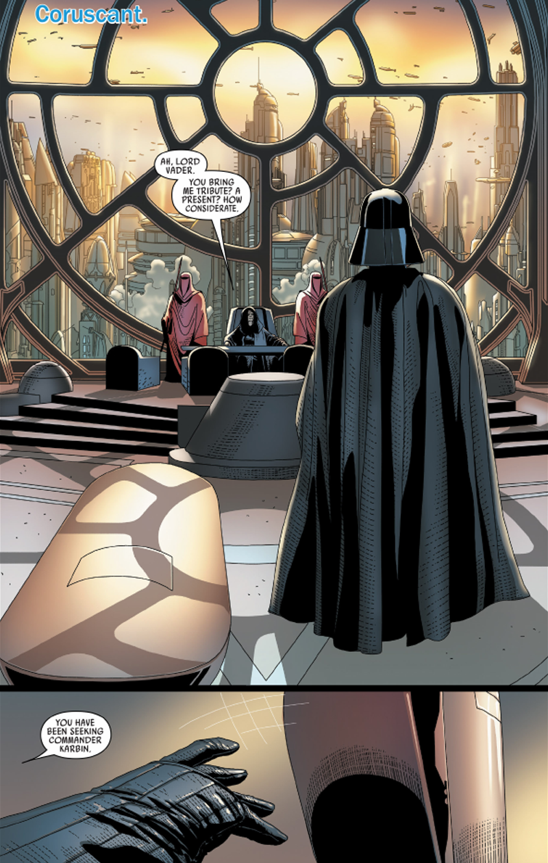 If you're not reading Marvel's Darth Vader comic, you're missing out. The series, which follows Vader's various adventures in the time between the original Star Wars and The Empire Strikes Back, has been consistently strong and the latest issue contained an all-time great moment for the Sith lord. Long story short: Emperor Palptaine has been training potential replacements for his right hand cyborg and Vader doesn't take to kindly to this. So he pays his boss a little visit, as you can see in the pages above. Thanks to io9 for the images.