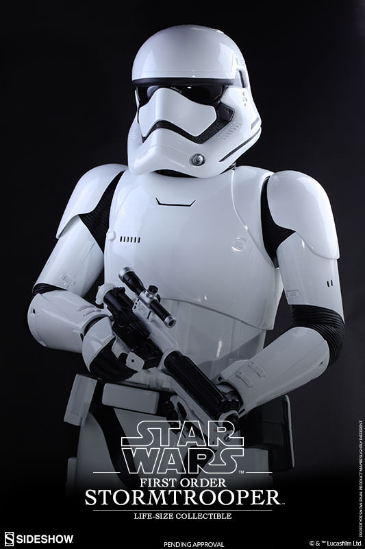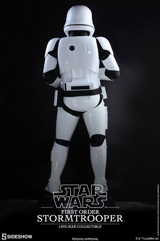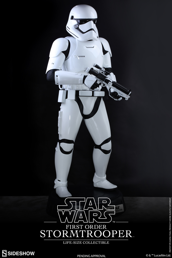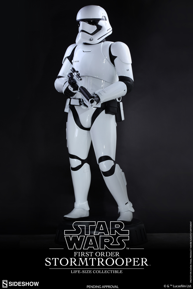 The movie-accurate and realistic life-size collectible will be available in selected markets and stands approximately 6.1ft/1.8m tall (approx. 6.7ft/2m tall with base). It features an authentic and detailed likeness of the First Order Stormtrooper, a meticulously sculpted First Order Stormtrooper helmet and armor, a special glossy paint application, a striking presence with a blaster rifle in hand, and a Star Wars themed circular base.