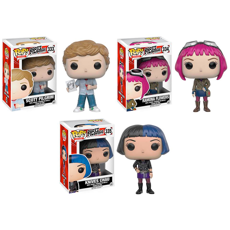 Coming in June are two net sets of those adorable Funko Pop Vinyl figures. Scott Pilgrim vs the World gets a trio of figures including Scott Pilgrim with a drawing of that one girl who looks like this, Ramona Flowers and her cool goggles, and Knives Chau with the blue highlights that get punched out of her hair. This is a good start, but I think we need some evil exes to complete the set.