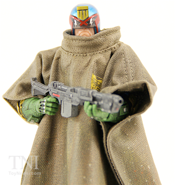 As part of their One:12 Collective line, the comic book version of Judge Dredd and his Lawmaster Bike get their own action figure set. Like any good Judge Dredd figure, the helmet is not removable. Dredd also comes with removable shoulder pads, utility belt (which holds two grenades and an extra magazine clip for the Lawgiver pistol). His boots have a removable knife, and you can toss a fabric rain poncho on the figure. Plus there's a daystick, working handcuffs, interchangeable hands and a rifle with removable magazine.