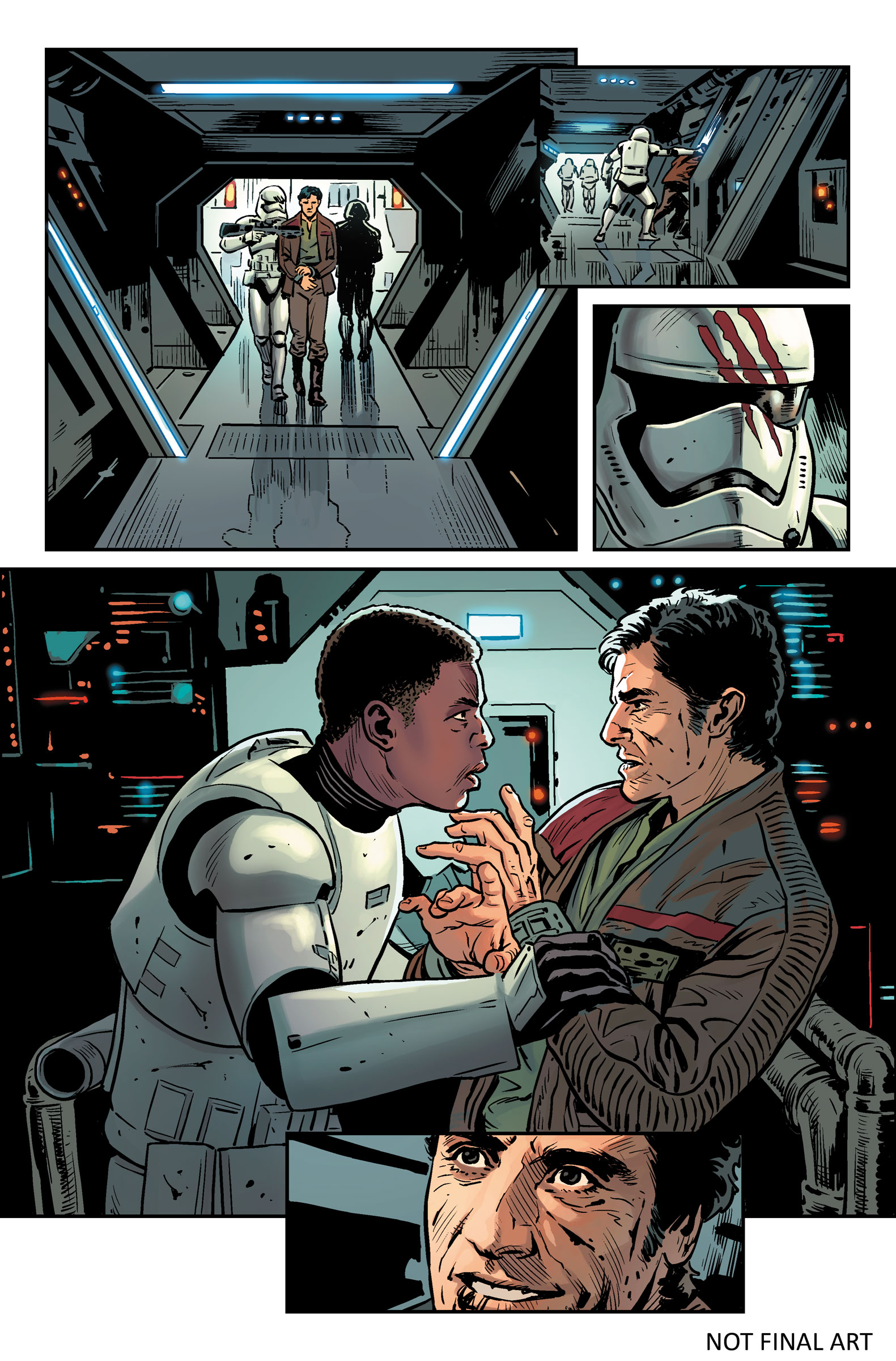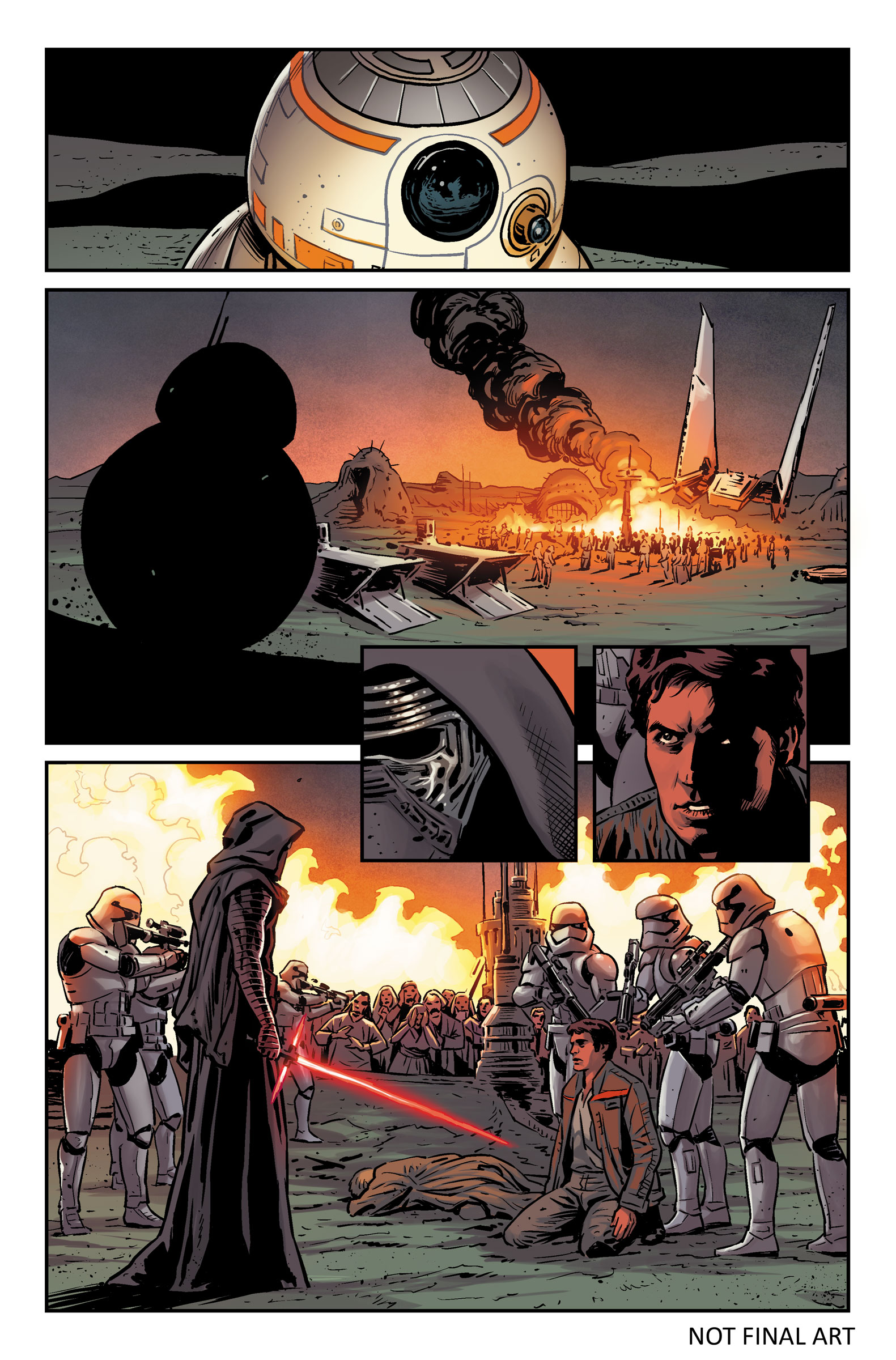 StarWars.com has revealed a few preview pages from Marvel Comics' upcoming miniseries adaptation of Star Wars: The Force Awakens. Written by Chuck Wendig (who also wrote Star Wars: Aftermath) and drawn by Luke Ross, the first issue is set to arrive on June 22. You can check out the pages below. The gorgeous cover seen above is by Esad Ribic, who most recently drew Marvel's surprisingly good Secret Wars event.