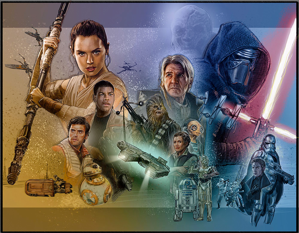 Much of the featured artwork is inspired by The Force Awakens, which isn't surprising. The sequel has offered a plethora of new characters to feature in artwork after having the same old heroes and villains to honor in art for decades, so artists undoubtedly want a change of pace after pumping the well dry for years.