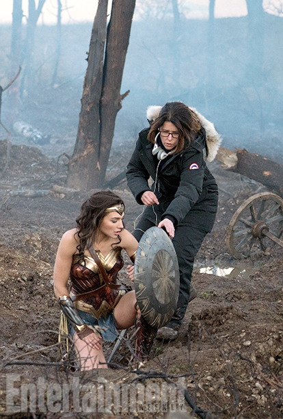 Otherwise, the rest of the photos don't tell us much. One features Gal Gadot taking direction in the woods from filmmaker Patty Jenkins (Monster) and another has our heroine kneeling beside Chris Pine in the woods, perhaps doing some surveillance on some kind of threat. The coolest photo in the batch is also a bit perplexing, because Gadot looks badass as she draws her trusty sword, but who could she possibly be preparing to fight in that dirty building?