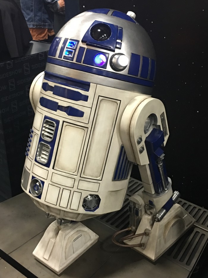 This is a life-size R2-D2 that makes sounds and lights up. This isn't the first time that Sideshow has made a replica of the famous astromech droid at this scale, but this time R2's dome head can swivel, and he'll come with a remote that will fit inside one of his compartments. However, that remote won't move him around on the floor or anything because he stays attached to base on which he sits. We were told the base was made a bit bigger this time because some people who bought the previous R2-D2 said they kept bumping into him when they got too close while walking by and would occasionally damage the little guy. No price or release date was revealed just yet as the paint was literally drying the night before preview night began.