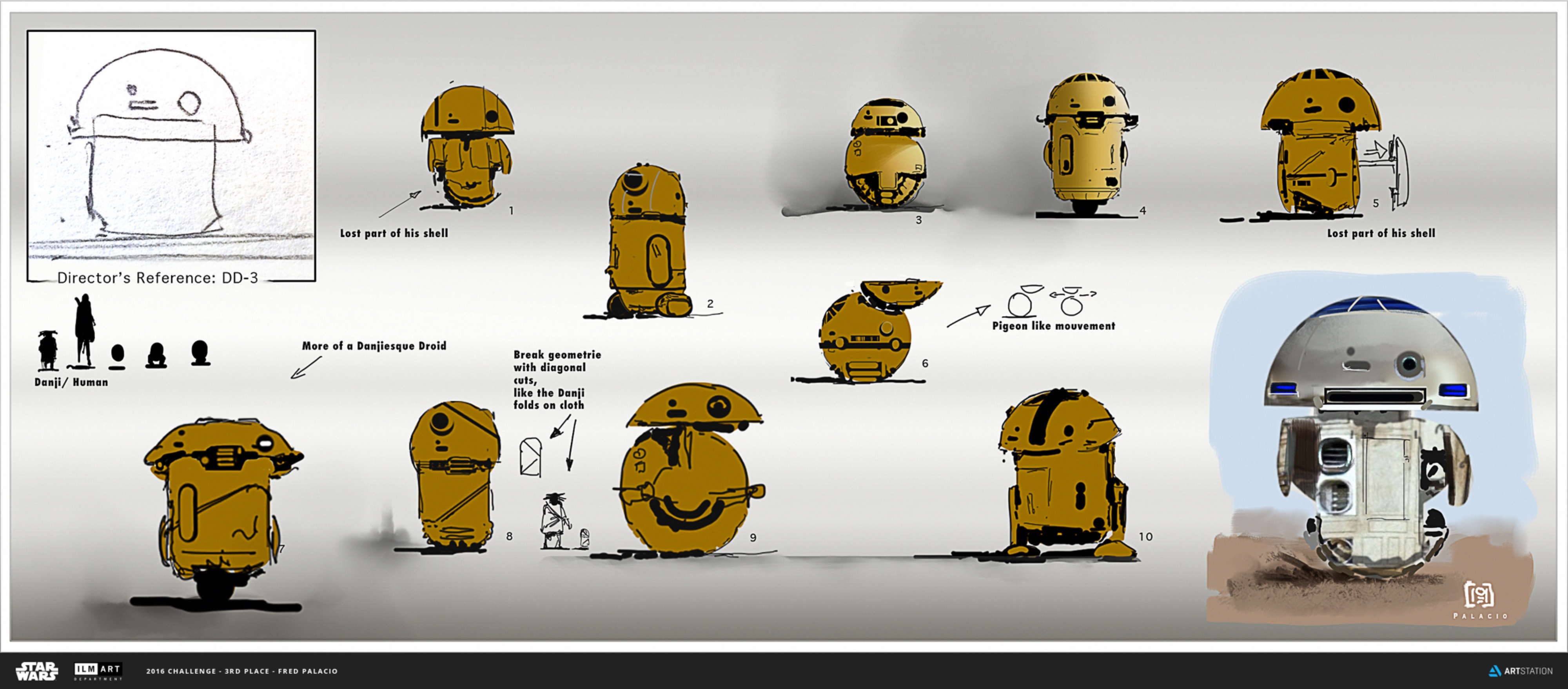 After three weeks of back to back challenges, 16 Art Directors from ILM judged the results to narrow the field down to eight finalists: Mario Alberti, Morgan Yon, Fred Palacio, Fan Gao, John Grello, Jesus Conde, Mack Sztaba, Igor Bulygin, Romain D'escienne, Justin Dring and Krzysztof Bielenin.