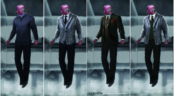 As for Vision, as you can see there were some alternate designs for the character's street clothes that he wore around The Avengers facility. Though they ultimately went with the sweater and dress pants style, there are some pretty cool looking tie and jacket combinations there as well. But in the end, those would have probably been too formal for him to wear casually.