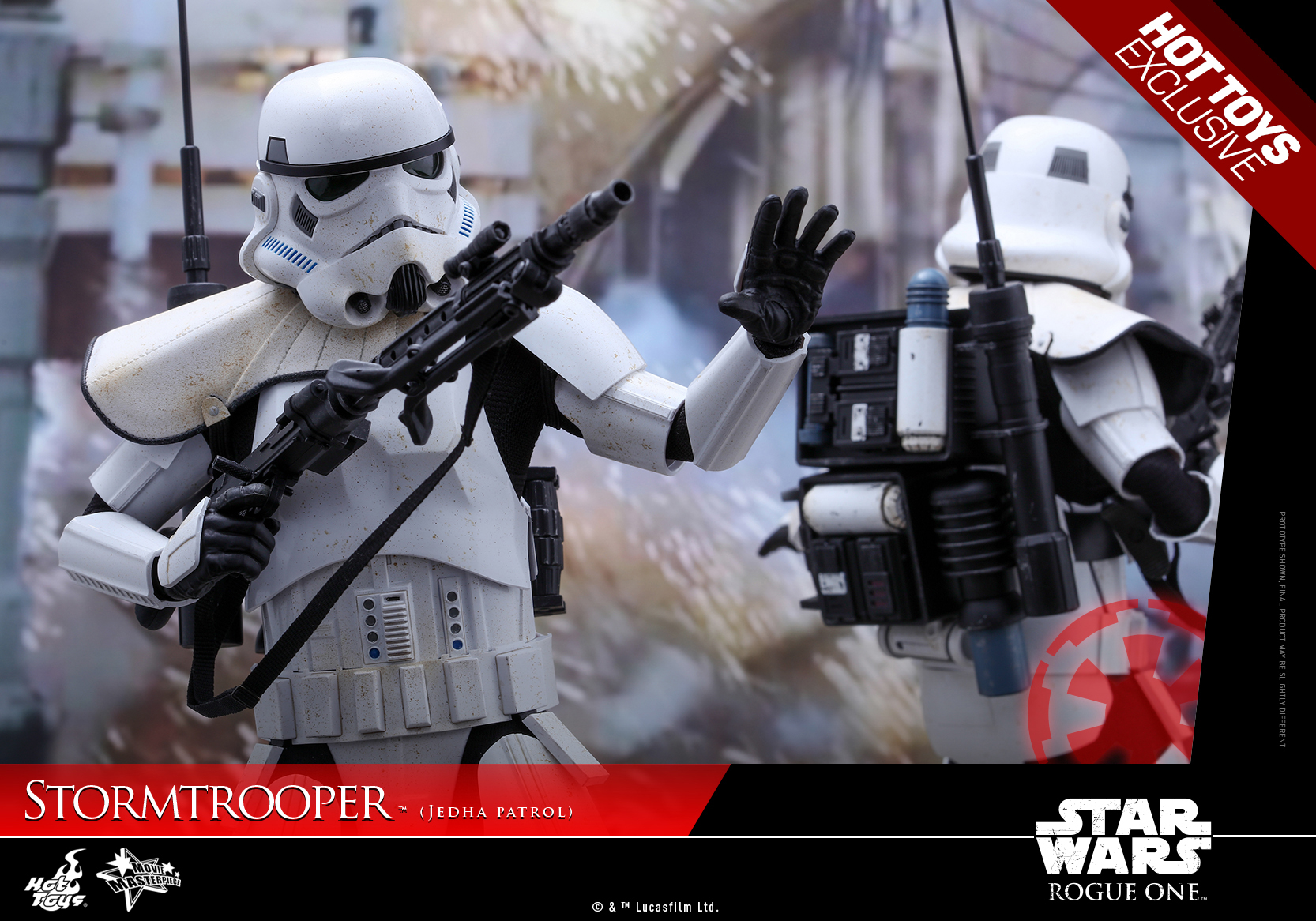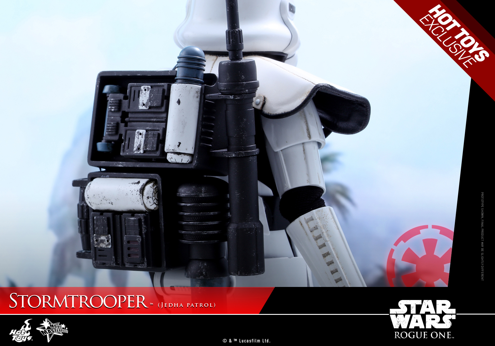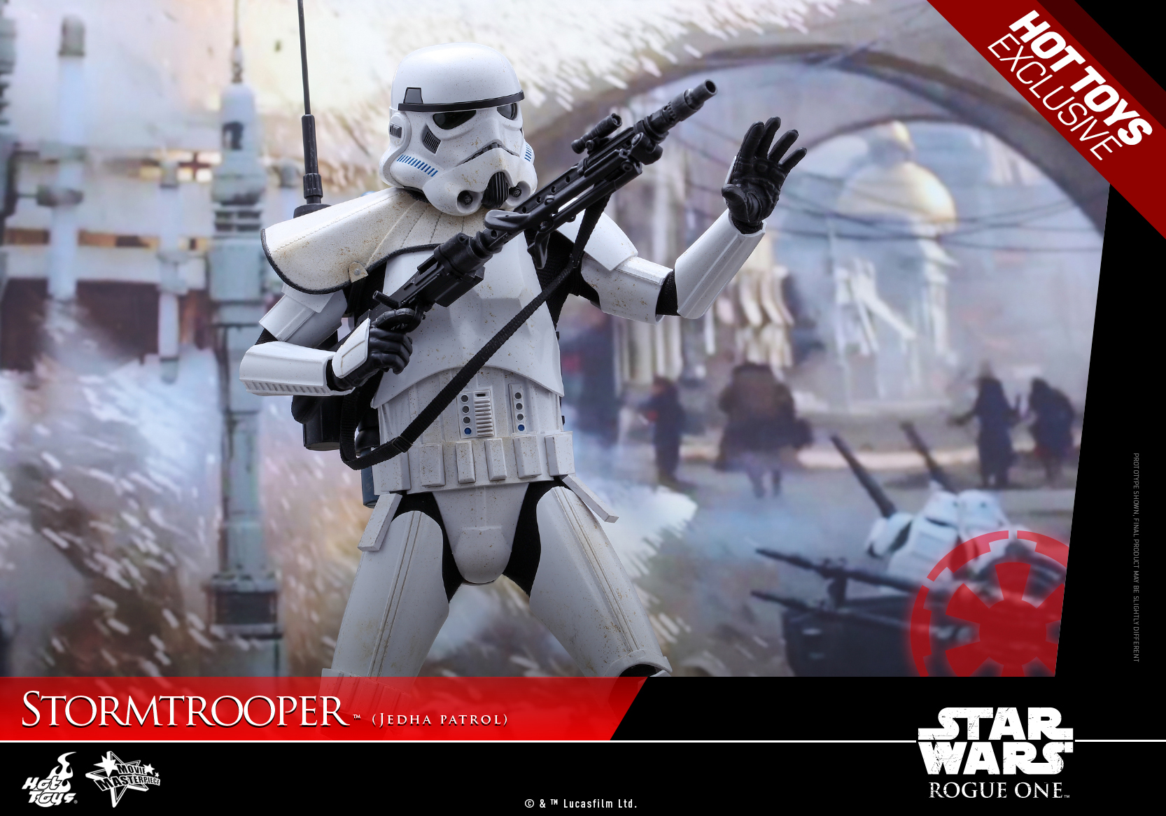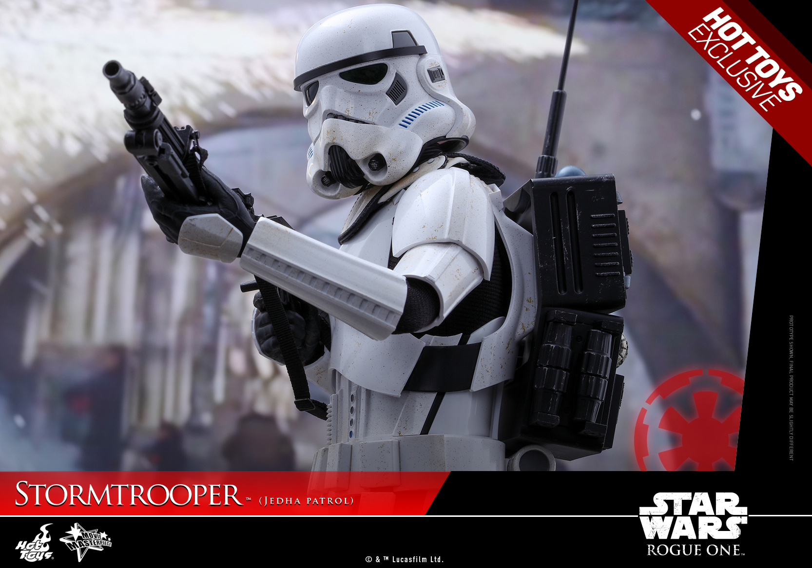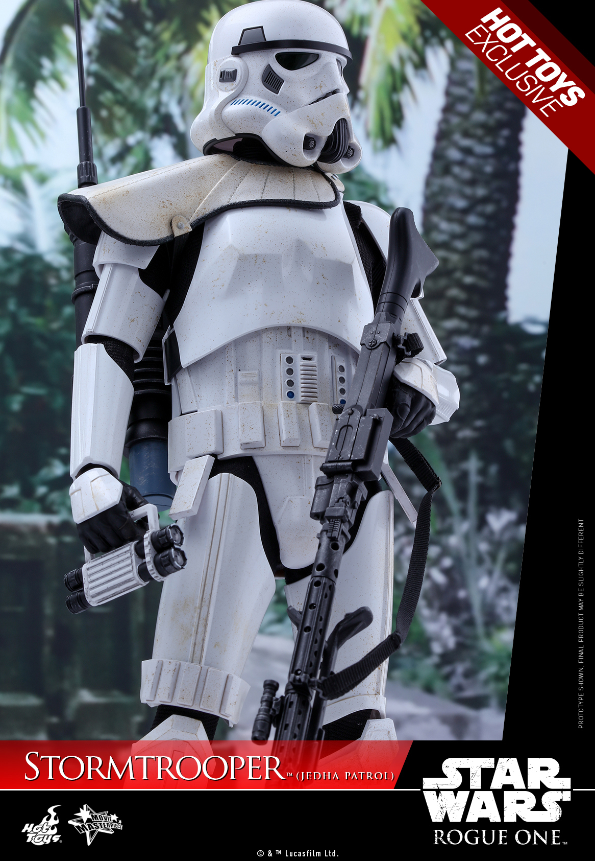 The highly accurate collectible figure is specially crafted based on the image of a specialized Stormtrooper patrolling the streets of planet Jedha in Rogue One: A Star Wars Story featuring a completely new Stormtrooper helmet and armor, newly developed fabric under-suit, newly designed backpack, white colored pauldron, detailed weapons and accessories, and a specially designed figure stand!